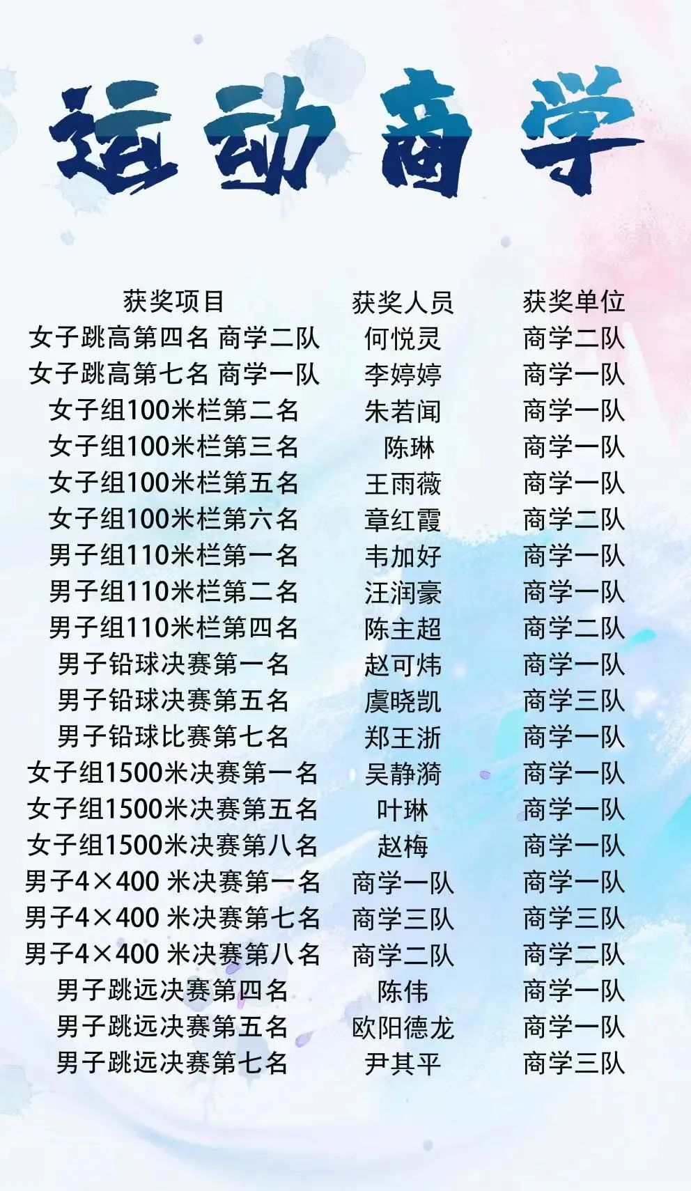 商学一队韦加好同学和汪润豪同学分别在男子组110米栏比赛中取得第一名和第二名的喜人成绩。商学一队在4×100米的团体赛中勇立潮头,摘得第一名的桂冠。