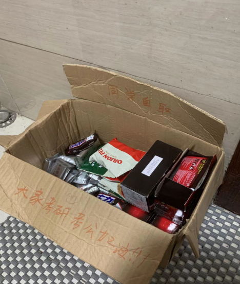 A:考研教室那边总有有很多温暖,不论是茶水间伙伴们的祝福和分享物资,还是饭后回来无意间出现在桌上朋友给的小零食,都觉得此刻不是自己一个人在战斗,也是备考过程中的小惊喜。