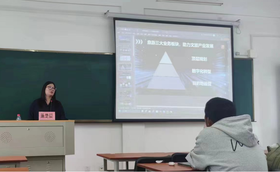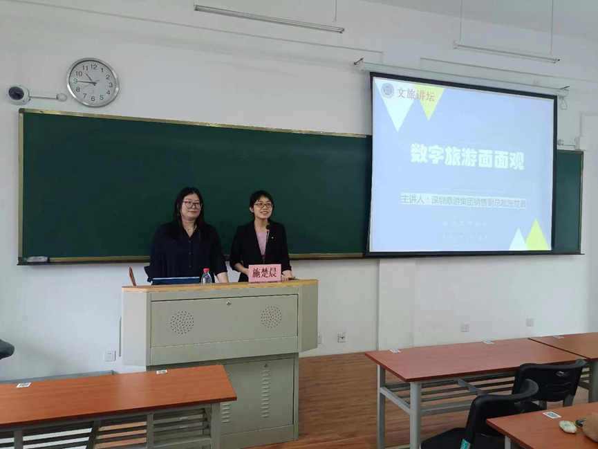 5月24日上午,文旅讲坛第11讲在我院2号楼212教室举行。本次讲座邀请到深圳鼎游信息技术有限公司集团销售副总裁、教育事业部总经理施楚晨,为我院学子带来《数字旅游面面观》的主题讲座。旅游管理专业教师主持了本次讲座。