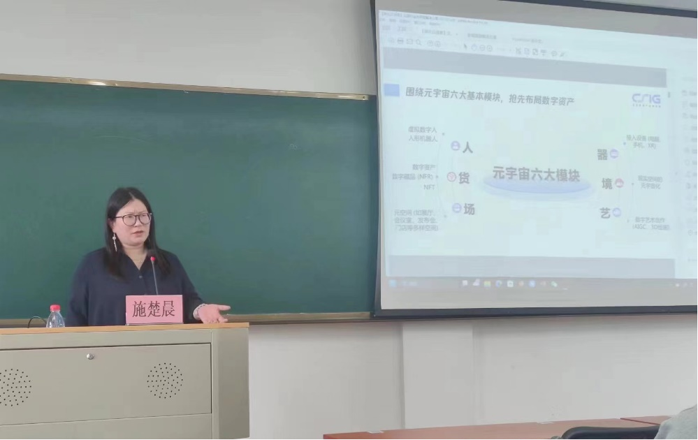 接着,围绕文旅元宇宙话题,介绍了当前公司为景区、文旅综合体等提供的元宇宙六大模块,并分别对人、货、场、器、境、艺等六个模块所蕴含的内容进行了阐述。其中有关数字虚拟人、数字资产、数字藏品、现实空间元宇宙化、数字艺术创作等内容及相应的案例使同学们进一步了解文旅行业的的前沿实践。施楚晨说,元宇宙文旅最大的特点是打破了传统的时间和空间的局限性,是对以往传统旅游形式的突破。数字正在改变我们的生活,数字旅游不仅新颖,还更加方便。随后,施楚晨详细介绍了数字孪生版本1.0和2.0的区别和联系。