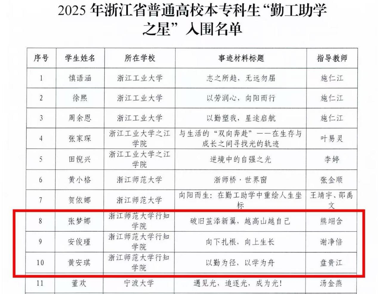 近日,浙江省学生资助管理中心下发《关于公布“助学·筑梦·铸人”2025年浙江省普通高校“勤工助学之星”“三助一辅之星”名单的通知》(浙学助〔2025〕3号)文件中,我院选送的张梦娜、黄安琪、安俊瑾三位同学入围2025年浙江省普通高校本专科生“勤工助学之星”。